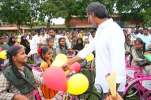 అద్దంకి నియోజకవర్గంలో దూరభారంతో పేద బాల, బాలికలు చదువు మానివేయకుండా ఉండాలన్న సదుద్దేశంతో దశలవారీగా 10 వేల సైకిళ్లు ఉచితంగా అందిస్తానని ఇచ్చిన హామీని రాష్ట్ర విద్యుత్ శాఖ మంత్రి గొట్టిపాటి రవికుమార్ నిలబెట్టుకున్నారు. ఈ మేరకు శుక్రవారం SEIL ఎనర్జీ ఇండియా లిమిటెడ్ వారి సహకారంతో సంతమాగులూరు మండలం, కొమ్మాలపాడు గ్రామంలోని మండల పరిషత్ ప్రాథమిక ఉన్నత పాఠశాలలో 104 మంది విద్యార్థులకు, మక్కెనవారిపాలెం గ్రామంలోని జెడ్పీ హైస్కూల్ లో 349 మంది విద్యార్థులకు ఉచితంగా సైకిళ్లు పంపిణీ చేశారు. ప్రభుత్వ పాఠశాలల్లో కష్టపడి చదువకుంటున్న విద్యార్ధినీ, విద్యార్ధులకు సైకిళ్ళు పంపిణీ చేయటం తనకెంతో సంతోషం కలిగిస్తుందని ఈ సందర్భంగా గొట్టిపాటి రవికుమార్ అన్నారు. విద్యతోనే వికాసం సాధ్యమవుతుందన్న డా.బి.ఆర్. అంబేద్కర్, మహాత్మా జ్యోతిరావ్ పూలే బాటలో బాల, బాలికల బంగారు భవిష్యత్తుకు తన వంతుగా పూర్తి సహాయ, సహకారాలు అందిస్తానని గొట్టిపాటి హామీ ఇచ్చారు.